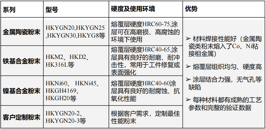 - 粉末类型多:金属陶瓷类、镍基自熔合金类、铁基自熔合金类…